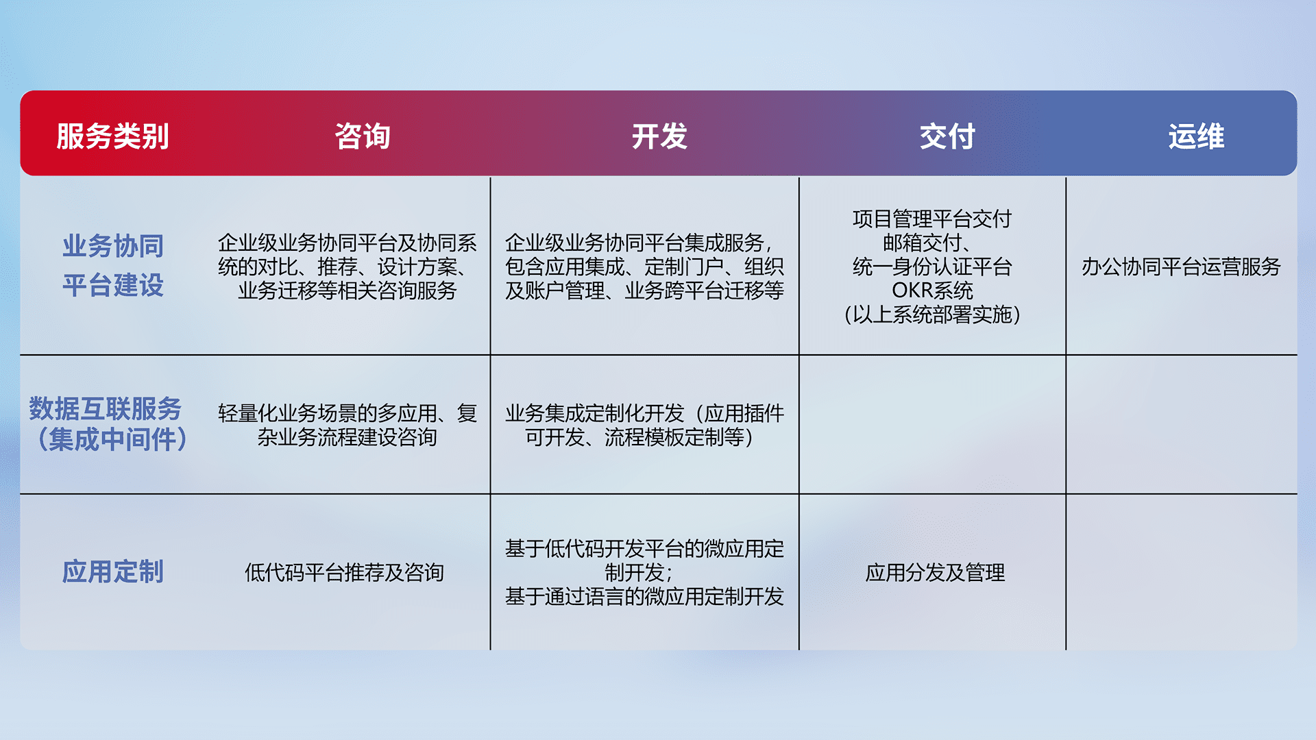 针对钉钉、、企微、、、、IDaas等平台级产品提供产品的规划、、、方案、、交付、、、、定制化开发等服务,,,,实现如统一协同办公、、、智能客户服务、、混合会议管理、、、、智能数据查询、、、等业务场景,,,实现数字化转型。。