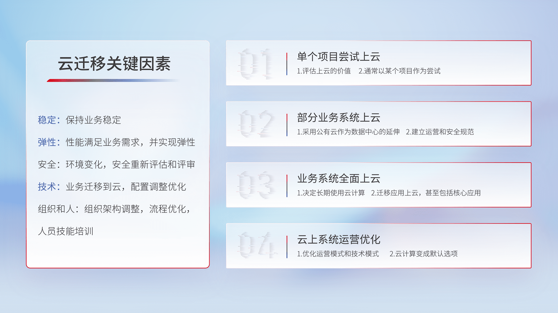结合实际业务,,,,从规划设计、、云平台选型、、、、云原生改造、、数据迁移、、集成交付,,迁移全过程为客户识别最佳上云路径,,做好风险识别管理,,,设计网络架构、、、、身份权限、、、安全审计合规、、、操作审计、、日志审计、、、监控告警策略、、多站点容灾设计等,,,对云上基础设施进行整体规划,,,提升IT治理水平,,以满足弹性、、高可用、、高性能的需求。。。。
