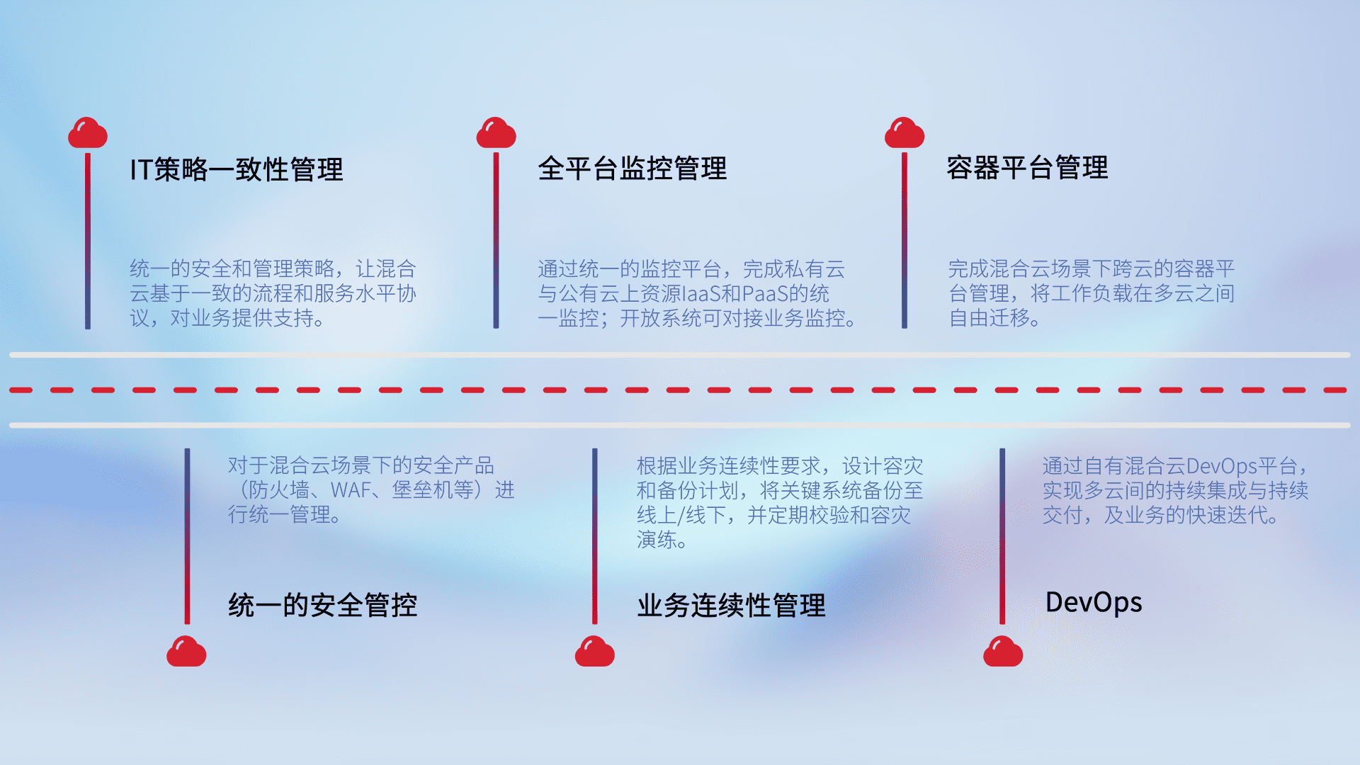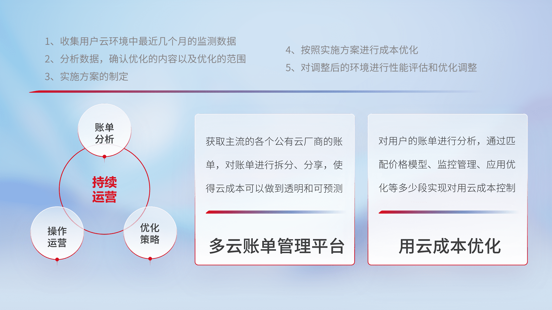 通过多云纳管,,,以统一的资源数据模型把客户的云资源进行抽象和封装,,,进而实现对多云资源的统一操作,,保障云资源管理的可靠性、、、稳定性与可用性。。量身定制化运维内容,,配置、、、开发运维、、补丁管理、、备份、、、、监控、、认证和访问管理、、、审计和日常巡检等,,,,保障在用云过程中的可靠度,,稳定度以及高可用率。。。。